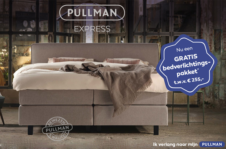 Van 1 oktober t/m 10 november 2025 ontvang je bij aankoop van een complete Pullman Express boxspringcombinatie een gratis bedverlichtingspakket t.w.v. €255,- cadeau.