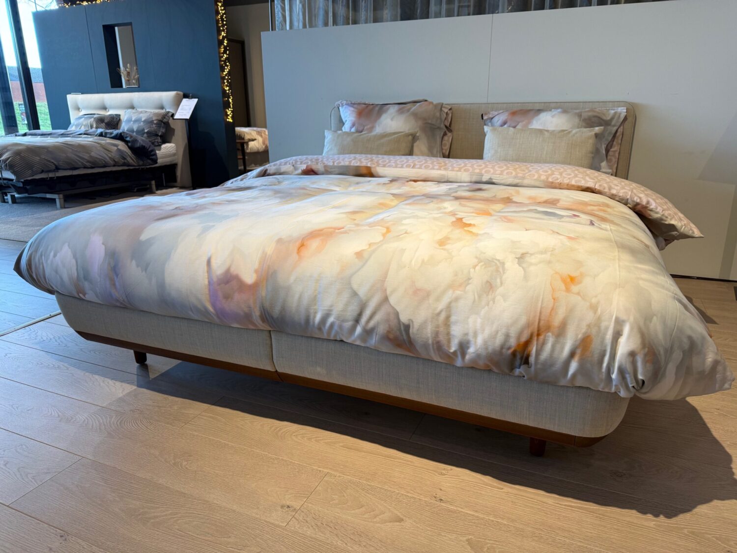 Het bed bestaat uit twee Curvo-boxsprings met daarboven twee Vispring Cannes-matrassen van 90 x 210 cm, één in de hardheid medium en één in firm. Hierdoor geniet u van een ondersteuning die nauwkeurig is afgestemd op uw lichaam en slaaphouding. Het geheel wordt verfijnd afgewerkt met het elegante hoofdbord Lisette, dat zorgt voor een tijdloze en uitnodigende uitstraling.